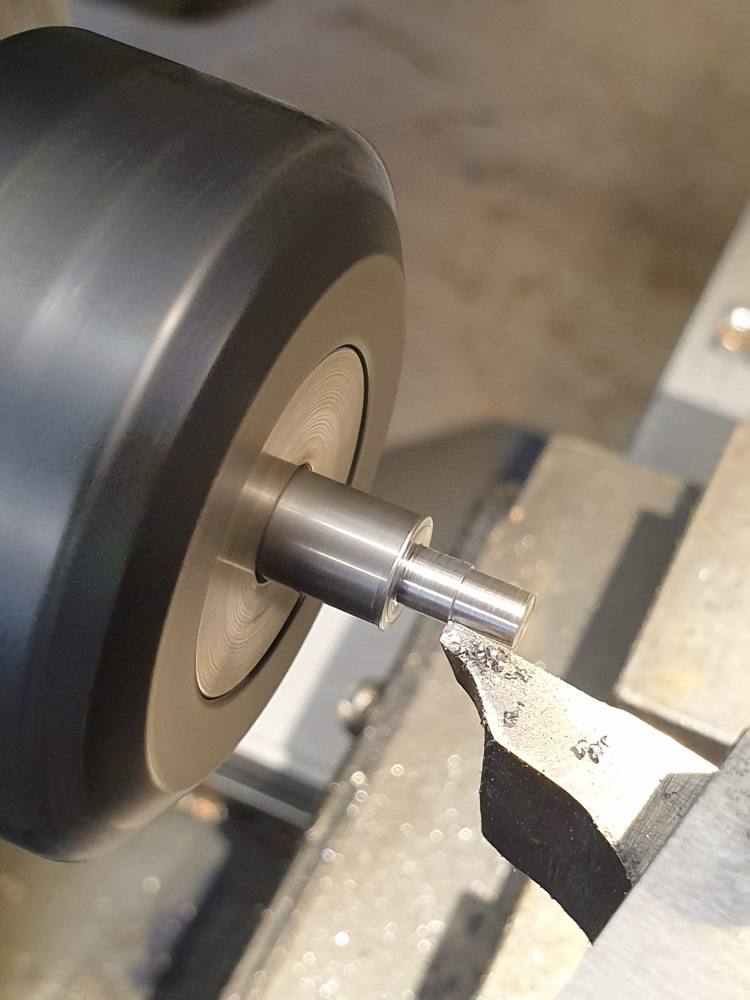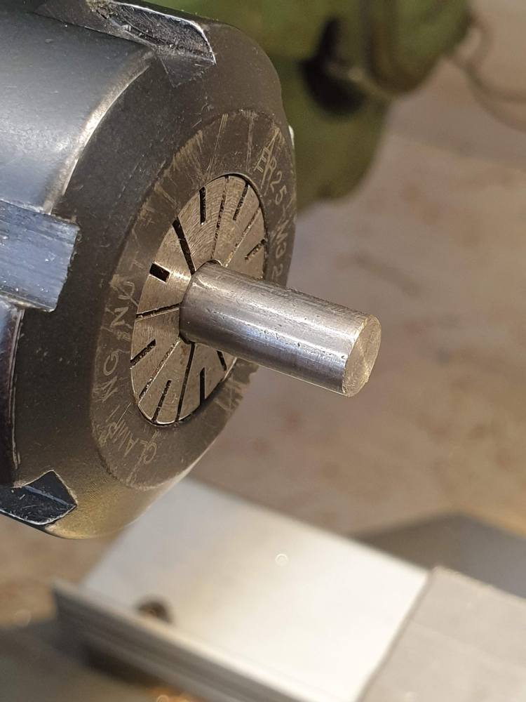 With the bar mounted in a collet on the lathe, you can face the end and start to cut the part of the screw which will eventually be threaded.