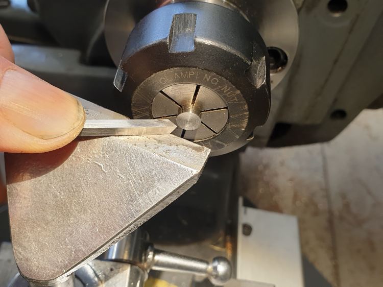 Once you are happy with the finish of the thread and the side of the screw head, you can part off the screw and mount the thread end in a collet for making the head.