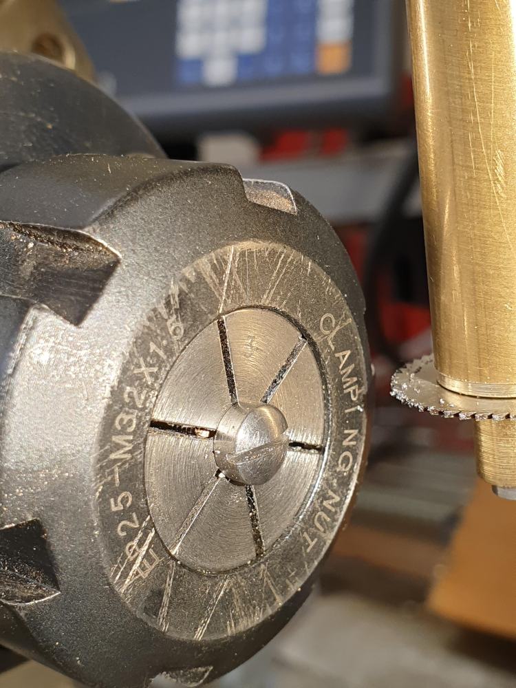 The collet chuck was removed from the lathe and mounted on a dividing head which was attached to a milling machine. A centred circular cutter could then be used for cutting the head with the help of some cutting oil. Picture showing start of cutting operation.