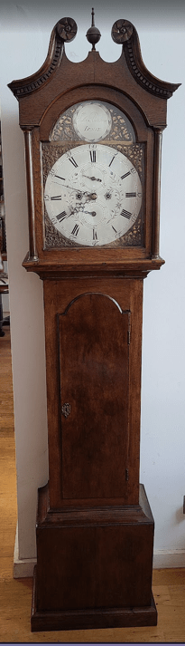 This is a 2 train rack striking clock with a brass silvered dial with recoil escapement. It has an oak case standing 80″ (2030mm) high. John Anderson is recorded as a clockmaker in Duns(e) between the dates of 1776 and 1802. The clock appears to have been resident in Scotland for much of its life with a receipt from an Edinburgh clockmaker in 1958 found in the case.