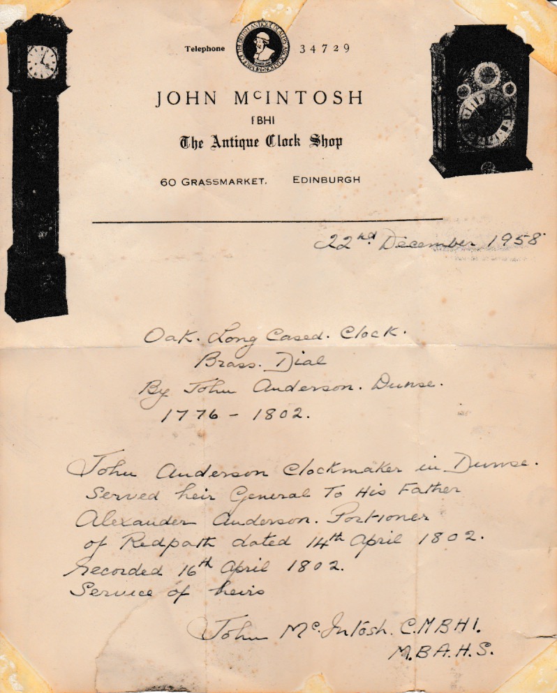 There are some other examples of John Anderson’s work on the Dunse History Society clocks page.